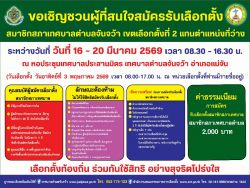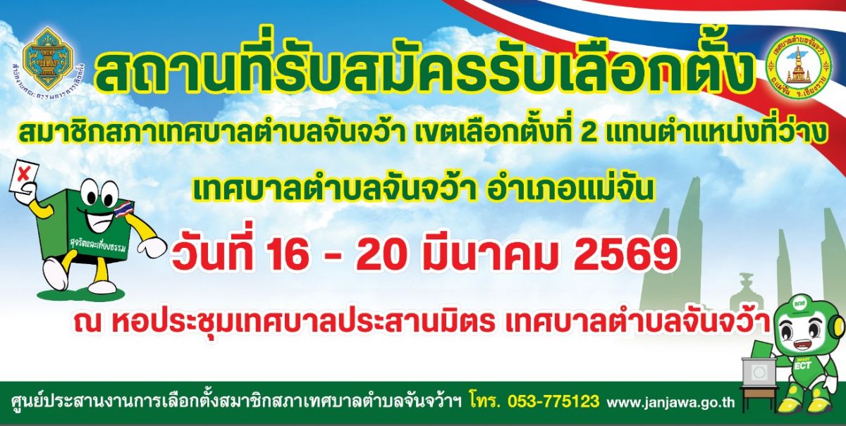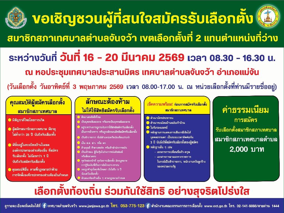 ขอเชิญชวนผู้ที่สนใจสมัครรับเลือกตั้ง สมาชิกสภาเทศบาลตำบลจันจว้า เขตเลือกตั้งที่ 2 (แทนตำแหน่งที่ว่าง) วันที่ 12 มีนาคม 2569 [ 09:42 น. ] เข้าชม 22 ครั้ง พิมพ์ ข่าวประชาสัมพันธ์ / ประกาศ ขอเชิญชวนผู้ที่สนใจสมัครรับเลือกตั้ง สมาชิกสภาเทศบาลตำบลจันจว้า เขตเลือกตั้งที่ 2 (แทนตำแหน่งที่ว่าง) ขอเชิญชวนผู้ที่สนใจสมัครรับเลือกตั้งสมาชิกสภาเทศบาลตำบลจันจว้า เขตเลือกตั้งที่ 2 (แทนตำแหน่งที่ว่าง) เปิดรับสมัคร วันที่ 16 – 20 มีนาคม 2569 เวลา 08.30 – 16.30 น. ณ หอประชุมเทศบาลประสานมิตร เทศบาลตำบลจันจว้า อำเภอแม่จัน ค่าธรรมเนียมการสมัคร 2,000 บาท วันเลือกตั้งวันอาทิตย์ที่ 3 พฤษภาคม 2569 เวลา 08.00 – 17.00 น.ณ หน่วยเลือกตั้งที่ท่านมีรายชื่ออยู่เลือกตั้งท้องถิ่น ร่วมกันใช้สิทธิ อย่างสุจริตโปร่งใส อัลบั้มภาพ